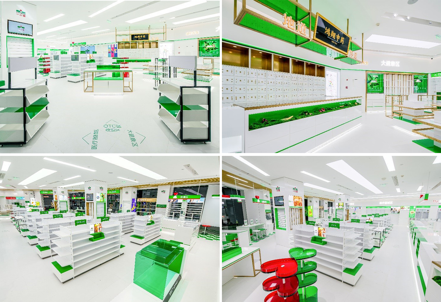 位置商標:我們為一心堂打造的最典型的位置商標有四處,分別為外立面綠色發光的健康之門、進門健康管理等區域的白綠格子、收銀臺LOGO造型吊燈、道具與吊眉的綠色條塊應用。這些位置商標是門店不可變動的元素,不同門店的復制和應用都將一直延用,直至成為顧客可以輕松描述的重要品牌資產。