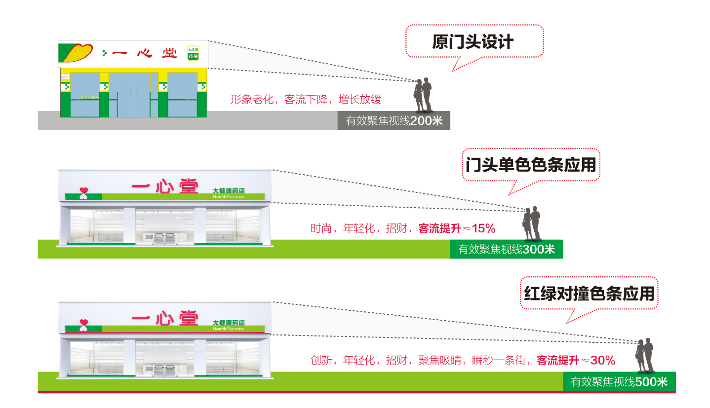 在零售行業,門頭就是“招財神”,也是藥店SI設計的第一步。既然門頭是“找財神”,那么招財的前提必須是先被看到,也就是要聚焦。因為消費者有一種本能就是尋找聚焦點,而色彩本身就是為了實現聚焦而存在的,所謂色彩營銷,就是要在銷售環境中為產品找到那個聚焦點,而門店的聚焦點就是門店的流量入口,所以一心堂的門頭開發策略就是色彩的營銷策略。