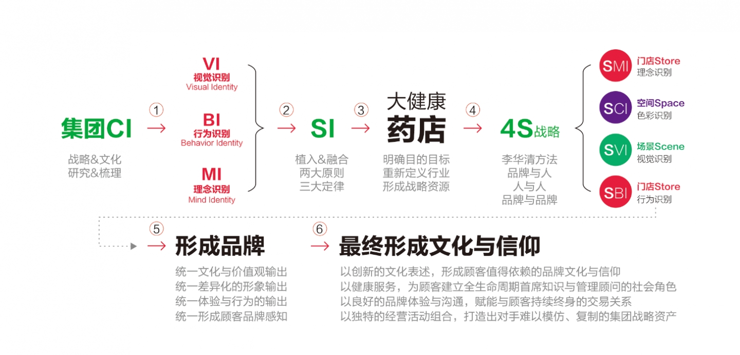 所以,SVI場景視覺體系包含傳統的SI工作,但是更強調專業化的品牌形象輸出。當時我們考察眾多藥店時得出了一個結論,換掉門頭便可以成為另外一家藥店。這就是藥店場景視覺體系沒有讓顧客形成統一的品牌印象,沒有形成藥店的品牌資產。